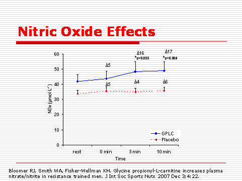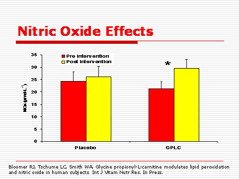 Bloomer: We have reported in two separate studies that GPLC results in an increase in blood levels of nitrate/nitrite (metabolites of NO). Figures 1 and 2 summarize our findings. Therefore, supplementation with GPLC may lead to an increase in NO in some individuals. That is, not all individuals may respond to treatment. We have noted that some are �responders� and some are �non-responders.� The same is true for most, if not all, nutritional supplements, despite what some companies lead consumers to believe in their hyped-up ads.