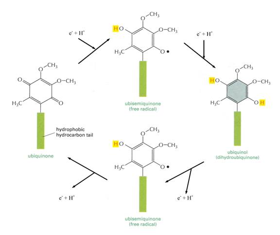 When Dr. Crane finally isolated this missing link, he determined the structure to be a quinone, a cyclic, unsaturated, diketone chemical structure. Quinones are not aromatic structures but are dienes and the carbonyl groups are ketone-like. Quinones are mobile, lipid-soluble carriers that shuttle electrons (and protons) between large, relatively immobile macromolecular complexes embedded in the membrane.