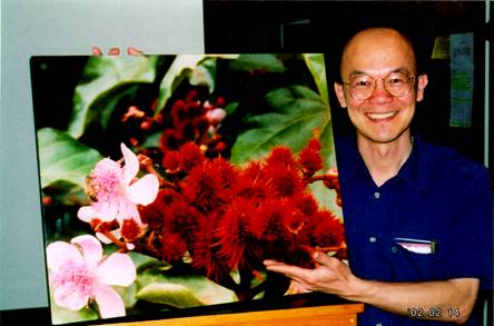 Figure 1: Dr. Barrie Tan poses with a photo of the annatto plant, which is an excellent source of tocotrienols.