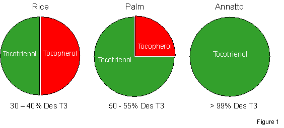 Tan: Some of the more readily available sources of tocotrienol in the diet include oils and fats, grains (such as barley, wheat and corn), certain fruits, nuts, meat and eggs. However, the percentages in these are quite small. To date, the major sources of tocotrienol are rice, palm and annatto. This is my rule of thumb: Rice is composed of 50% tocotrienol and 50% tocopherol, while palm contains about 75% tocotrienol and 25% tocopherol. Annatto is the only known source containing 100% tocotrienol without tocopherol (see Figure 3).