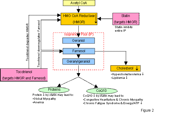 Tan: Our body manufactures a pool of basic isoprenoids (Isoprenoid Pool) for many systemic functions downstream. It is generally understood that farnesol is the last committed step for cholesterol synthesis in mammals, including humans. Therefore, GG is the first uncommitted step to cholesterol synthesis and the first committed to many syntheses, including CoQ10 and proteins (see Figure 4). Taking statins depletes the isoprenoid pool, along with farnesol (hence the cholesterol reduction) and GG (hence the undesired myopathy, anemia, chronic fatigue, etc.). These isoprenoids are competitively dropped. These are not just �side effects,� but �major effects� systemic to the body. Therefore, statins are not �specific� cholesterol reducers, but �indiscriminate� cholesterol reducers. Tocotrienols are not an HMGR competitive inhibitors and do not affect GG.