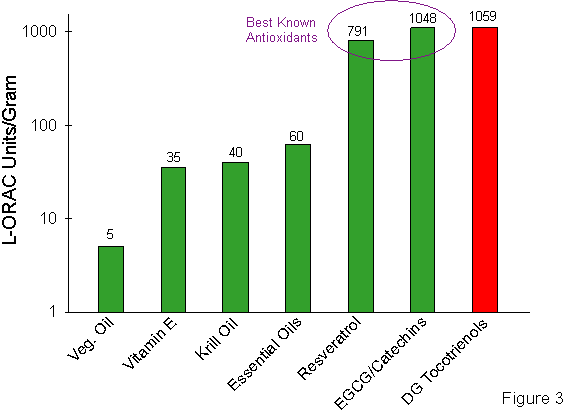 Finally, tocotrienol has superior antioxidant properties that may be attributed to its effect on cancer and inflammation. Tocotrienol may reduce lipid peroxidation and inhibit formation of mutagenic nitrogenous species, therefore preventing DNA mutations that increase the risk of cancer (14). For example, tocotrienol may inhibit cancer by the quenching of free radicals or increase the efficacy of antitumor actions by strengthening the immune system (15). Interestingly, a mixture of tocopherol-free delta- and gamma-tocotrienol had lipid Oxygen Radical Absorbance Capacity (ORAC) values that were about 30 times greater than vitamin E (as alpha-tocopherol), and also slightly better than those of the more highly regarded antioxidants resveratrol and EGCG (see Figure 5). This is a good measure of tocotrienol�s antioxidant properties.